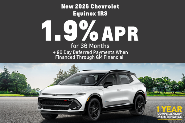 Ex: VIN: 3GNAXTEGXTL361869. MSRP: $38,885. 1.9% APR for 36 months for well-qualified buyers when financed through GM Financial. $28.60 per month per every $1,000 financed. 90 day deferred payments; interest accrues from date of purchase. With approved credit. Not all will qualify. On select models. 1 vehicle in stock at this price. One year of complimentary maintenance includes one oil change and one tire rotation. Good on select new and used vehicles. See the dealer of complete maintenance details. Advertised Price EXCLUDES all optional dealer offered items, accessories, or product addendums optionally selected by the purchaser, applicable official taxes and fees, and a $436 documentary fee. See dealer for details. Offer Expires 3/1/2026.