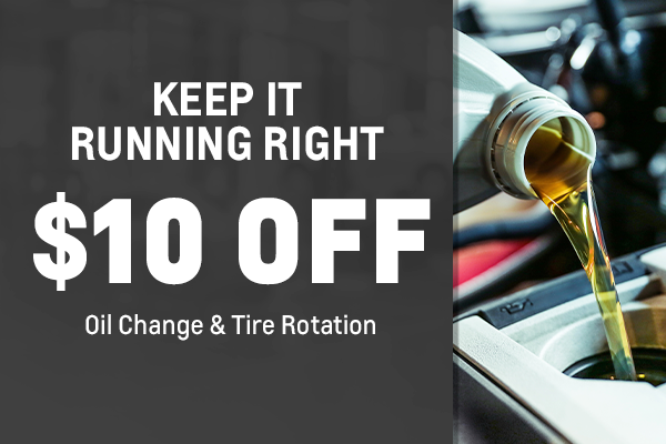 Plus tax and applicable fees. Includes oil change with manufacturer-recommended oil and standard tire rotation. Synthetic oil and specialty filters may cost extra. May not be combined with other offers. Must present coupon at time of service write-up. See dealer for details.