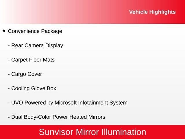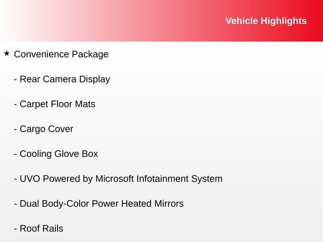 Cargo Cover, Carpet Floor Mats, Convenience Package, Cooling Glove Box, Dual Body-Color Power Heated Mirrors, Rear Camera Display, Rear Park Assist Backup Warning System Sensor, Rear Spoiler, Roof Rails, Sunvisor Mirror Illumination, Tilt & Telescopic Steering Column, UVO Powered by Microsoft Infotainment System.