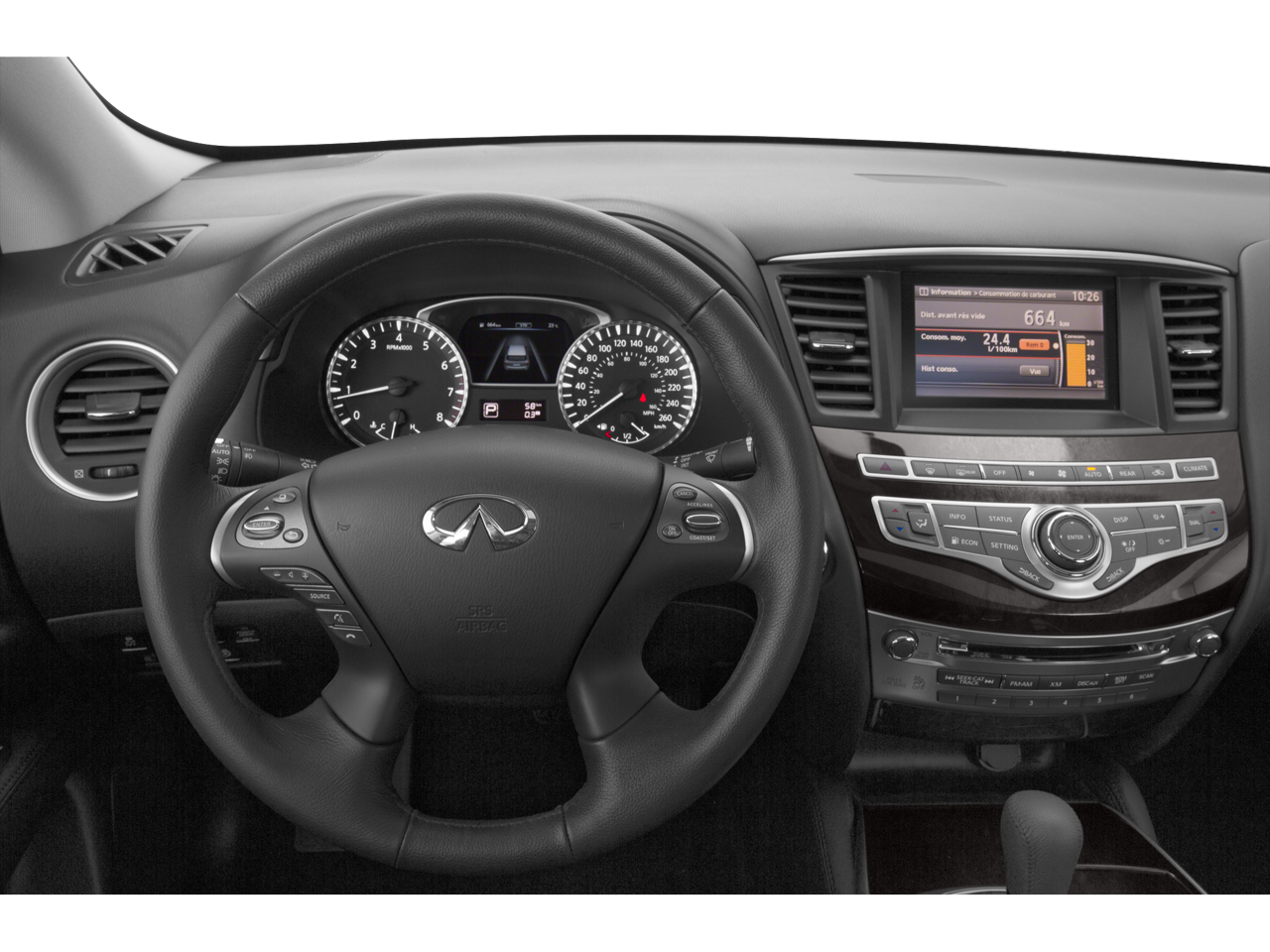 - Radio: AM/FM/CD/MP3 Audio System -inc: 6-speakers, Radio Data System (RDS), speed-sensitive volume control, Bluetooth® Hands-free phone system, illuminated steering wheel-mounted audio controls, USB connection port for iPod interface and other compatible devices, SiriusXM Satellite radio, auxiliary audio/video input jacks in front center console and INFINITI controller for comfort and convenience features