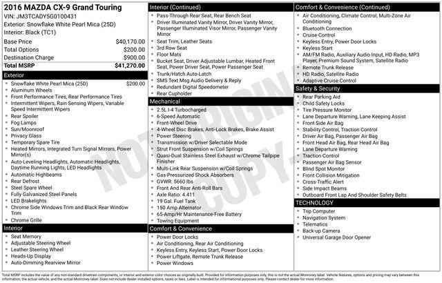 Snowflake White Pearl Mica 2016 Mazda CX-9 Grand Touring FWD 6-Speed Automatic 2.5L 4-Cylinder WE DELIVER ANYWHERE, 12 Speakers, 3rd row seats: bench, 4-Wheel Disc Brakes, ABS brakes, Aha Internet Radio, Air Conditioning, Alloy wheels, AM/FM radio: SiriusXM, Auto High-beam Headlights, Auto-dimming Rear-View mirror, Automatic temperature control, Axle Ratio: 4.411, Brake assist, Bumpers: body-color, Compass, Delay-off headlights, Driver door bin, Driver vanity mirror, Dual front impact airbags, Dual front side impact airbags, E911 Automatic Emergency Notification, Electronic Stability Control, Emergency communication system: Mazda Connect, Exterior Parking Camera Rear, Four wheel independent suspension, Front anti-roll bar, Front Bucket Seats, Front Center Armrest, Front dual zone A/C, Front fog lights, Front reading lights, Fully automatic headlights, Garage door transmitter: HomeLink, Heads-Up Display, Heated door mirrors, Heated Front Bucket Seats, Heated front seats, Illuminated entry, Infotainment System Voice Command, Lane Departure Warning System, Leather Shift Knob, Leather steering wheel, Leather Trimmed Seats, Low tire pressure warning, Memory seat, Navigation System, Occupant sensing airbag, Outside temperature display, Overhead airbag, Overhead console, Pandora Internet Radio, Panic alarm, Passenger door bin, Passenger vanity mirror, Power door mirrors, Power driver seat, Power Liftgate, Power moonroof, Power passenger seat, Power steering, Power windows, Radio Broadcast Data System Program Information, Radio data system, Radio: AM/FM Sound System w/Bose Audio, Rain sensing wipers, Rear air conditioning, Rear anti-roll bar, Rear Parking Sensors, Rear seat center armrest, Rear window defroster, Rear window wiper, Remote keyless entry, Roof rack: rails only, SIRIUSXM Satellite Radio, SMS Text Msg Audio Delivery & Reply, Speed control, Speed-sensing steering, Split folding rear seat, Spoiler, Steering wheel mounted audio controls, Stitcher Internet Radio, Tachometer, Telescoping steering wheel, Tilt steering wheel, Traction control, Trip computer, Turn signal indicator mirrors, Variably intermittent wipers, Wheels: 20 x 8.5J Aluminum Alloy.