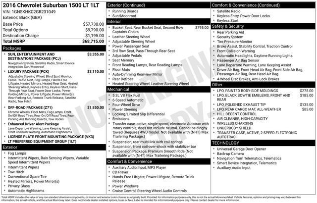 18 x 8.5 High-Polished Aluminum Finish Wheels, 1st & 2nd Row Color-Keyed Carpeted Floor Mats, 2 Front Frame-Mounted Black Recovery Hooks, 2-Speed Active Electronic AutoTrac Transfer Case, 2nd Row 60/40 Split-Folding Manual Bench, 2nd Row Pwr Release 60/40 Split Folding Bench Seat, 3rd Row 60/40 Power Fold Split-Bench, 3rd Row DVD Screen, 3rd Row Manual 60/40 Split-Folding Fold Flat Bench, 3rd row seats: split-bench, 4-Wheel Antilock Disc Brakes, 4-Wheel Disc Brakes, 5 12-Volt Auxiliary Power Outlets, 6-Way Power Front Passenger Seat Adjuster, 9 Speakers, ABS brakes, Adjustable pedals, Air Conditioning, All-Weather Rear Cargo Mat (LPO), Alloy wheels, AM/FM radio: SiriusXM, Apple CarPlay, Auto High-beam Headlights, Auto-dimming door mirrors, Auto-Dimming Inside Rear-View Mirror, Auto-dimming Rear-View mirror, Automatic temperature control, Black Assist Steps, Black Tow Hooks, Black Tubular Assist Steps, Bose Premium Audio System Feature, Brake assist, Bumpers: body-color, CD player, Color-Keyed Carpeting Floor Covering, Compass, Delay-off headlights, Driver & Front Passenger Airbags, Driver door bin, Driver vanity mirror, Dual front impact airbags, Dual front side impact airbags, Electronic Cruise Control w/Set & Resume Speed, Electronic Stability Control, Emergency communication system: OnStar Guidance, Enhanced Driver Alert Package (Y86), Enhanced Driver Instrument Information Display, Extended-Range Remote Keyless Entry, Exterior Parking Camera Rear, Floor Console w/Storage Area, Fog Lamps, Forward Collision Alert Sensor Indicator, Front & Rear Black Bowtie Emblems (LPO), Front & Rear Parking Assist, Front anti-roll bar, Front Bucket Seats, Front Center Armrest, Front dual zone A/C, Front reading lights, Front wheel independent suspension, Fully automatic headlights, Garage door transmitter, Hands Free Power Liftgate, HD Radio, Heated 2nd Row Seats, Heated door mirrors, Heated Front Reclining Bucket Seats, Heated front seats, Heated Leather Wrapped Steering Wheel, Hill Descent Control, Illuminated entry, Intellibeam Headlamps w/Automatic High Bean On/Off, Lane Departure Warning & Safety Alert Seat, Lane Keep Assist, Leather-Appointed Seat Trim, Leather-Wrapped Steering Wheel, License Plate Front Mounting Package, Low tire pressure warning, Luxury Package, Memory seat, Memory Settings, Occupant sensing airbag, Off-Road Z71 Suspension Package, OnStar Basic Plan For 5 Years, OnStar w/4G LTE, Outside temperature display, Overhead airbag, Overhead console, Painted Body-Side Moldings (LPO) (DISC), Panic alarm, Passenger door bin, Passenger vanity mirror, Passive Entry System, Pedal memory, Polished Exhaust Tip, Power door mirrors, Power driver seat, Power Folding & Adjustable Heated Outside Mirrors, Power Liftgate, Power passenger seat, Power Release 2nd Row Bucket Seats, Power steering, Power Tilt & Telescoping Steering Column, Power Tilt-Sliding Sunroof w/Express-Open/Close, Power windows, Power-Adjustable Accelerator & Brake Pedals, Preferred Equipment Group 1LT, Premium Smooth Ride Suspension Package, Push Button Keyless Start, Radio: Chevrolet MyLink AM/FM Stereo, Radio: Chevrolet MyLink AM/FM Stereo w/Navigation, Rain sensing wipers, Rear air conditioning, Rear anti-roll bar, Rear Cross-Traffic Alert Sensor Indicator, Rear Park Assist w/Audible Warning, Rear reading lights, Rear seat center armrest, Rear Seat Entertainment System, Rear window defroster, Rear window wiper, Remote keyless entry, Roof rack: rails only, Roof-Mounted Luggage Rack Side Rails, Security system, Side Blind Zone Alert w/Lane Change Alert, Single-Slot CD/MP3 Player, SiriusXM Satellite Radio, Speed control, Speed-sensing steering, Split folding rear seat, Spoiler, Steering wheel mounted audio controls, Sun, Entertainment & Destinations Package, Tachometer, Telescoping steering wheel, Tilt steering wheel, Traction control, Trip computer, Universal Home Remote