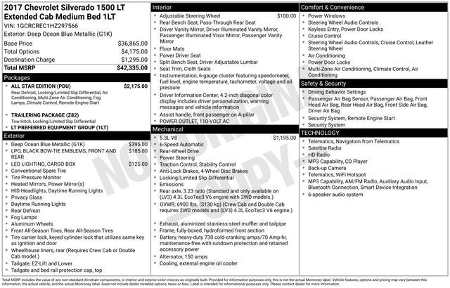 Deep Ocean Blue Metallic 2017 Chevrolet Silverado 1500 LT LT1 RWD 6-Speed Automatic Electronic with Overdrive EcoTec3 5.3L V8 WE DELIVER ANYWHERE, 6-Speed Automatic Electronic with Overdrive, Black Cloth, 110-Volt AC Power Outlet, 150 Amp Alternator, 4.2 Diagonal Color Display Driver Info Center, 6 Speaker Audio System, All Star Edition, Bluetooth® For Phone, Body Color Bodyside Moldings, Body-Color Door Handles, Body-Color Mirror Caps, Body-Color Power Adjustable Heated Outside Mirrors, Chrome Grille Surround, Color-Keyed Carpeting w/Rubberized Vinyl Floor Mats, Deep-Tinted Glass, Driver & Front Passenger Illuminated Vanity Mirrors, Dual-Zone Automatic Climate Control, Electric Rear-Window Defogger, EZ Lift & Lower Tailgate, Front Chrome Bumper, HD Radio, Leather Wrapped Steering Wheel w/Cruise Controls, Manual Tilt Wheel Steering Column, OnStar 3 Months Guidance Plan, OnStar w/4G LTE, Power Windows w/Driver Express Up, Preferred Equipment Group 1LT, Rear 60/40 Folding Bench Seat (Folds Up), Rear Chrome Bumper, Rear Vision Camera, Rear Wheelhouse Liners, Remote Keyless Entry, Remote Locking Tailgate, Remote Vehicle Starter System, Single Slot CD/MP3 Player, Steering Wheel Audio Controls, Thin Profile LED Fog Lamps, Trailering Package, 10-Way Power Driver's Seat Adjuster, 3.23 Rear Axle Ratio, 3.42 Rear Axle Ratio, 4-Wheel Disc Brakes, 40/20/40 Front Split Bench Seat, 6 Speakers, ABS brakes, Air Conditioning, Alloy wheels, AM/FM radio: SiriusXM, Auxiliary External Transmission Oil Cooler, Bodyside moldings, Brake assist, Bumpers: chrome, CD player, Cloth Seat Trim, Compass, Delay-off headlights, Driver door bin, Driver vanity mirror, Dual front impact airbags, Dual front side impact airbags, Electronic Stability Control, Emergency communication system: OnStar Guidance, Exterior Parking Camera Rear, Front & Rear Black Bowtie Emblems (LPO), Front anti-roll bar, Front Center Armrest w/Storage, Front reading lights, Front wheel independent suspension, Fully automatic headlights, Heated door mirrors, Heavy Duty Suspension, Heavy-Duty Rear Locking Differential, High-Intensity Discharge Headlights, Illuminated entry, LED Cargo Box Lighting, Low tire pressure warning, Manual Tilt/Telescoping Steering Column, Occupant sensing airbag, Outside temperature display, Overhead airbag, Overhead console, Panic alarm, Passenger door bin, Passenger vanity mirror, Power door mirrors, Power steering, Power windows, Premium audio system: Chevrolet MyLink, Radio data system, Radio: AM/FM 8 Diagonal Color Touch Screen, Rear reading lights, Rear step bumper, Remote keyless entry, SiriusXM Satellite Radio, Speed control, Speed-sensing steering, Split folding rear seat, Steering wheel mounted audio controls, Tachometer, Theft Deterrent System (Unauthorized Entry), Tilt steering wheel, Traction control, Trip computer, Variably intermittent wipers, Voltmeter, Wheels: 17 x 8 Bright Machined Aluminum, 6-Speed Automatic Electronic with Overdrive, Black Cloth, 110-Volt AC Power Outlet, 150 Amp Alternator, 4.2 Diagonal Color Display Driver Info Center, 6 Speaker Audio System, All Star Edition, Bluetooth® For Phone, Body Color Bodyside Moldings, Body-Color Door Handles, Body-Color Mirror Caps, Body-Color Power Adjustable Heated Outside Mirrors, Chrome Grille Surround, Color-Keyed Carpeting w/Rubberized Vinyl Floor Mats, Deep-Tinted Glass, Driver & Front Passenger Illuminated Vanity Mirrors, Dual-Zone Automatic Climate Control, Electric Rear-Window Defogger, EZ Lift & Lower Tailgate, Front Chrome Bumper, HD Radio, Leather Wrapped Steering Wheel w/Cruise Controls, Manual Tilt Wheel Steering Column, OnStar 3 Months Guidance Plan, OnStar w/4G LTE, Power Windows w/Driver Express Up, Preferred Equipment Group 1LT, Rear 60/40 Folding Bench Seat (Folds Up), Rear Chrome Bumper, Rear Vision Camera, Rear Wheelhouse Liners, Remote Keyless Entry, Remote Locking Tailgate, Remote Vehicle Starter System
