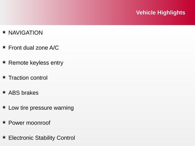ABS brakes, Active Cruise Control, Alloy wheels, Compass, Electronic Stability Control, Front dual zone A/C, Heated door mirrors, HEATED FRONT SEATS, Illuminated entry, Low tire pressure warning, NAVIGATION, Power moonroof, Remote keyless entry, Traction control.