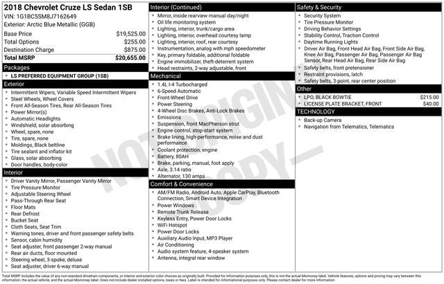 Arctic Blue Metallic 2018 Chevrolet Cruze LS FWD 6-Speed Automatic 1.4L 4-Cylinder Turbo DOHC CVVT WE DELIVER ANYWHERE, Preferred Equipment Group 1SB, 15 Steel Wheels w/Full Bolt-On Wheel Covers, 4 Speakers, 4-Speaker Audio System Feature, 4-Wheel Disc Brakes, ABS brakes, Air Conditioning, AM/FM radio, Apple CarPlay/Android Auto, Black Bowtie (LPO), Brake assist, Bumpers: body-color, Cloth Seat Trim, Compass, Delay-off headlights, Driver 6-Way Manual Seat Adjuster, Driver door bin, Driver vanity mirror, Dual front impact airbags, Dual front side impact airbags, Electronic Stability Control, Emergency communication system: OnStar Guidance, Exterior Parking Camera Rear, Front anti-roll bar, Front Bucket Seats, Front Center Armrest, Front License Plate Bracket, Front Passenger 2-Way Manual Seat Adjuster, Front wheel independent suspension, Fully automatic headlights, Illuminated entry, Knee airbag, Low tire pressure warning, Occupant sensing airbag, Outside temperature display, Overhead airbag, Panic alarm, Passenger door bin, Passenger vanity mirror, Power door mirrors, Power steering, Power windows, Radio data system, Radio: AM/FM Chevrolet MyLink w/7 Touch-Screen, Rear side impact airbag, Rear window defroster, Remote keyless entry, Security system, Tachometer, Telescoping steering wheel, Tilt steering wheel, Traction control, Trip computer, Variably intermittent wipers, Voltmeter, Preferred Equipment Group 1SB.