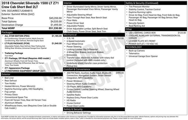 Clean CARFAX. Priced below KBB Fair Purchase Price! Summit White 2018 Chevrolet Silverado 1500 LT LT2 EcoTec3 5.3L V8 6-Speed Automatic Electronic with Overdrive 4WD