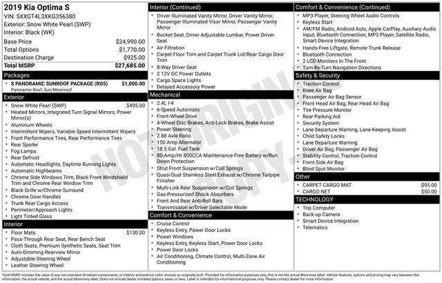 4-Wheel Disc Brakes, 6 Speakers, ABS brakes, Air Conditioning, Alloy wheels, AM/FM radio: SiriusXM, Anti-whiplash front head restraints, Apple CarPlay & Android Auto, Auto High-beam Headlights, Auto-dimming Rear-View mirror, Automatic temperature control, Brake assist, Bumpers: body-color, Cargo Net, Carpet Cargo Mat, Carpet Floor Mats, Delay-off headlights, Driver door bin, Driver vanity mirror, Dual front impact airbags, Dual front side impact airbags, Electronic Stability Control, Emergency communication system: UVO eServices, Four wheel independent suspension, Front anti-roll bar, Front Bucket Seats, Front Center Armrest, Front dual zone A/C, Front fog lights, Front reading lights, Fully automatic headlights, Heated door mirrors, Illuminated entry, Knee airbag, Leather steering wheel, Low tire pressure warning, Occupant sensing airbag, Outside temperature display, Overhead airbag, Overhead console, Panic alarm, Passenger door bin, Passenger vanity mirror, Power door mirrors, Power driver seat, Power steering, Power windows, Radio data system, Radio: AM/FM/MP3/SiriusXM Audio System, Rear anti-roll bar, Rear seat center armrest, Rear window defroster, Remote keyless entry, S Panoramic Sunroof Package, Security system, Speed control, Speed-sensing steering, Split folding rear seat, Spoiler, Sport Cloth Seat Trim, Steering wheel mounted audio controls, Tachometer, Telescoping steering wheel, Tilt steering wheel, Traction control, Trip computer, Turn signal indicator mirrors, Variably intermittent wipers, Wheels: 7.5J x 18 Machine Finish Alloy.