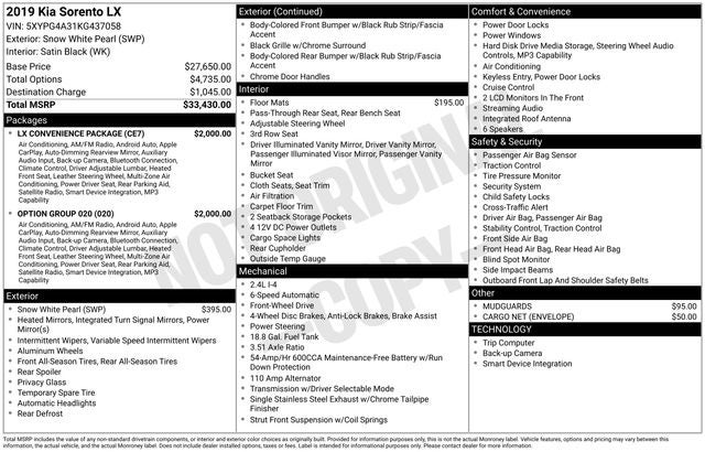 Snow White Pearl 2019 Kia Sorento LX FWD 6-Speed Automatic with Sportmatic I4 10-Way Power Adjustable Driver Seat, 17 x 7.0 Alloy Wheels, 3.51 Axle Ratio, 3rd row seats: split-bench, 4-Wheel Disc Brakes, 6 Speakers, ABS brakes, Air Conditioning, Alloy wheels, AM/FM radio, Apple CarPlay & Android Auto, Auto-Dimming Rear-View Mirror, Brake assist, Bumpers: body-color, Cargo Net (Envelope), Carpeted Floor Mats (7-Passenger), Delay-off headlights, Driver door bin, Driver vanity mirror, Dual front impact airbags, Dual front side impact airbags, Dual Zone Automatic Climate Control, Electronic Stability Control, Exterior Parking Camera Rear, Four wheel independent suspension, Front anti-roll bar, Front Bucket Seats, Front Center Armrest, Front reading lights, Fully automatic headlights, Heated door mirrors, Heated Front Seats, Illuminated entry, Leather Wrapped Steering Wheel & Shift Knob, Low tire pressure warning, LX Convenience Package, Mudguards, Occupant sensing airbag, Outside temperature display, Overhead airbag, Overhead console, Panic alarm, Park Distance Warning-Reverse, Passenger door bin, Passenger vanity mirror, Power door mirrors, Power steering, Power windows, Radio data system, Radio: UVO eServices, Radio: UVO Play w/AM/FM/MP3, Rear anti-roll bar, Rear seat center armrest, Rear window defroster, Rear window wiper, Remote keyless entry, Roof Rails (Silver), Security system, Speed control, Speed-sensing steering, Split folding rear seat, Spoiler, Steering wheel mounted audio controls, Tachometer, Telescoping steering wheel, Tilt steering wheel, Traction control, Trip computer, Turn signal indicator mirrors, Variably intermittent wipers, YES Essentials Cloth Seat Trim.