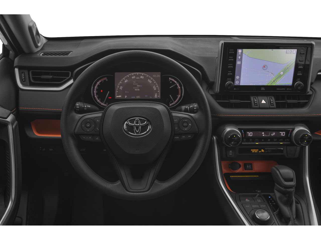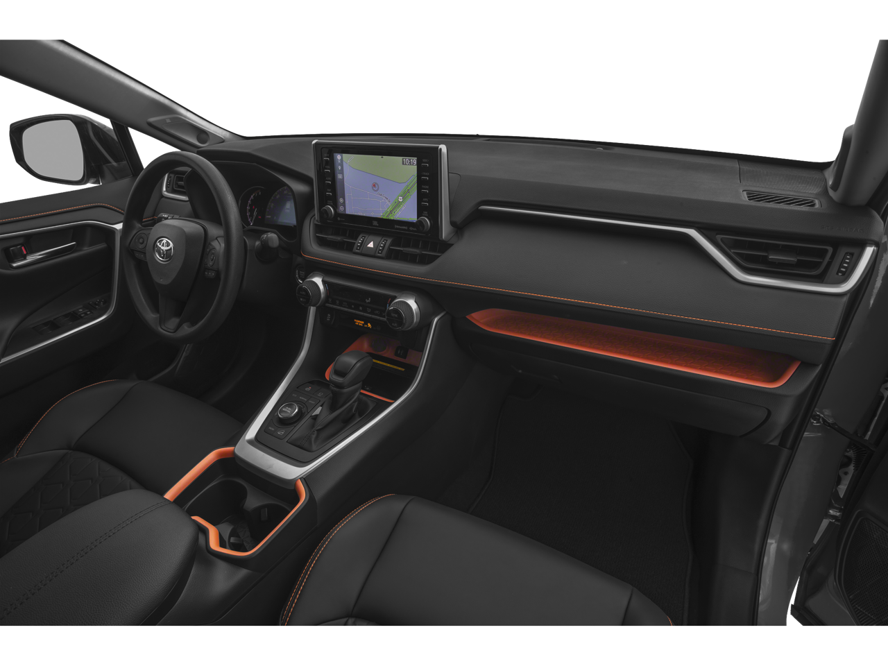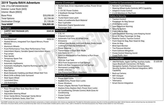 2019 Toyota RAV4 Adventure AWD 8-Speed Automatic 2.5L 4-Cylinder DOHC Dual VVT-i 4-Wheel Disc Brakes, 6 Speakers, ABS brakes, Air Conditioning, Alloy wheels, AM/FM radio: SiriusXM, Apple CarPlay, Auto High-beam Headlights, Automatic temperature control, Axle Ratio: 3.177, Brake assist, Bumpers: body-color, Delay-off headlights, Driver door bin, Driver vanity mirror, Dual front impact airbags, Dual front side impact airbags, Electronic Stability Control, Emergency communication system: Entune Safety Connect, Exterior Parking Camera Rear, Four wheel independent suspension, Front anti-roll bar, Front Bucket Seats, Front Center Armrest, Front dual zone A/C, Front fog lights, Front reading lights, Fully automatic headlights, Heated door mirrors, Illuminated entry, Knee airbag, Low tire pressure warning, Occupant sensing airbag, Outside temperature display, Overhead airbag, Overhead console, Panic alarm, Passenger door bin, Passenger vanity mirror, Power door mirrors, Power driver seat, Power Liftgate, Power steering, Power windows, Radio data system, Radio: Entune 3.0 Audio Plus, Rear anti-roll bar, Rear seat center armrest, Rear window defroster, Rear window wiper, Remote keyless entry, Roof rack: rails only, Security system, SofTex Seat Trim, Speed control, Speed-sensing steering, Split folding rear seat, Spoiler, Steering wheel mounted audio controls, Tachometer, Telescoping steering wheel, Tilt steering wheel, Traction control, Trip computer, Turn signal indicator mirrors, Variably intermittent wipers, Wheels: 19 x 7.5J Alloy.