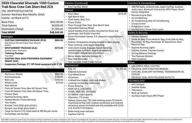 Northsky Blue Metallic 2020 Chevrolet Silverado 1500 Custom Trail Boss 4WD 6-Speed Automatic Electronic with Overdrive EcoTec3 5.3L V8 WE DELIVER ANYWHERE, 6-Speed Automatic Electronic with Overdrive, 4WD, Black Cloth, 170 Amps Alternator, 3.5 Diagonal Monochromatic Display, Bluetooth® For Phone, Color-Keyed Carpeting Floor Covering, Custom Convenience Package, Deep-Tinted Glass, Electric Rear-Window Defogger, EZ Lift Power Lock & Release Tailgate, Front Rubberized Vinyl Floor Mats, Heavy-Duty Rear Locking Differential, High Gloss Black Grille, Hitch Guidance, Infotainment Package, LED Cargo Area Lighting, Locking Tailgate, Manual Tilt-Wheel Steering Column, OnStar & Chevrolet Connected Services Capable, Performance Red Recovery Hooks, Power Door Locks, Power Front Windows w/Driver Express Up/Down, Power Front Windows w/Passenger Express Down, Power Rear Windows w/Express Down, Preferred Equipment Group 2CX, Rear 60/40 Folding Bench Seat (Folds Up), Rear Rubberized-Vinyl Floor Mats, Remote Keyless Entry, Remote Vehicle Starter System, SiriusXM Radio, Steering Wheel Mounted Electronic Cruise Control, Suspension Package, Trailering Package, 3.42 Rear Axle Ratio, 4-Wheel Disc Brakes, 4 Black Round Assist Steps (LPO), 4G LTE Wi-Fi Hot Spot Capable, 6 Speakers, ABS brakes, Air Conditioning, All-Weather Floor Liner (LPO) (AAK), Alloy wheels, Apple CarPlay/Android Auto, Auxiliary External Transmission Oil Cooler, Brake assist, Chevrolet Connected Access Capable, Chevytec Spray-On Black Bedliner, Cloth Seat Trim, Compass, Delay-off headlights, Driver door bin, Driver vanity mirror, Dual Exhaust w/Polished Outlets, Dual front impact airbags, Dual front side impact airbags, Electronic Stability Control, Exterior Parking Camera Rear, Front 40/20/40 Split-Bench Seat, Front anti-roll bar, Front Center Armrest, Front reading lights, Front wheel independent suspension, Fully automatic headlights, Heated door mirrors, High Capacity Air Filter, Hill Descent Control, Illuminated entry, Low tire pressure warning, Occupant sensing airbag, Off-Road Suspension w/2 Lift, Outside temperature display, Overhead airbag, Overhead console, Panic alarm, Passenger door bin, Passenger vanity mirror, Polished Exhaust Tip, Power door mirrors, Power steering, Power windows, Radio data system, Radio: Chevrolet Infotainment 3 System, Rear reading lights, Rear step bumper, Remote keyless entry, Speed control, Speed-sensing steering, Split folding rear seat, Tachometer, Theft Deterrent System (Unauthorized Entry), Tilt steering wheel, Traction control, Trip computer, Variably intermittent wipers, Voltmeter, Wheel Locks (Set of 4) (LPO), Wheels: 18 x 8.5 Black Painted Aluminum, Wheels: 20 x 9 Painted Aluminum, 6-Speed Automatic Electronic with Overdrive, 4WD, Black Cloth, 170 Amps Alternator, 3.5 Diagonal Monochromatic Display, Bluetooth® For Phone, Color-Keyed Carpeting Floor Covering, Custom Convenience Package, Deep-Tinted Glass, Electric Rear-Window Defogger, EZ Lift Power Lock & Release Tailgate, Front Rubberized Vinyl Floor Mats, Heavy-Duty Rear Locking Differential, High Gloss Black Grille, Hitch Guidance, Infotainment Package, LED Cargo Area Lighting, Locking Tailgate, Manual Tilt-Wheel Steering Column, OnStar & Chevrolet Connected Services Capable, Performance Red Recovery Hooks, Power Door Locks, Power Front Windows w/Driver Express Up/Down, Power Front Windows w/Passenger Express Down, Power Rear Windows w/Express Down, Preferred Equipment Group 2CX, Rear 60/40 Folding Bench Seat (Folds Up), Rear Rubberized-Vinyl Floor Mats, Remote Keyless Entry, Remote Vehicle Starter System, SiriusXM Radio, Steering Wheel Mounted Electronic Cruise Control, Suspension Package, Trailering Package.