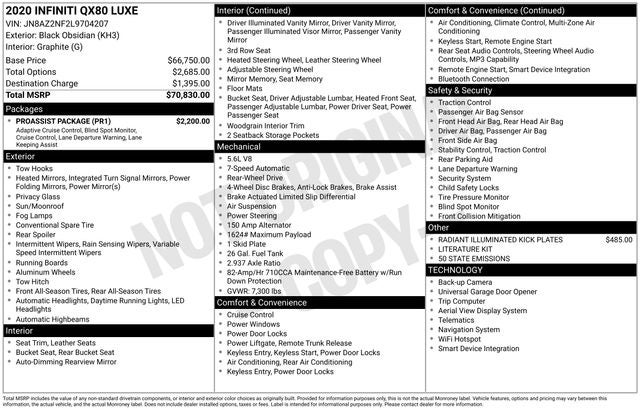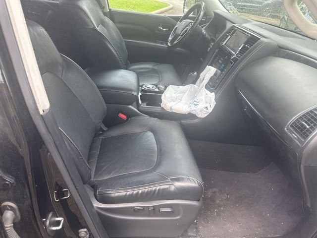 Clean CARFAX. Black Obsidian 2020 INFINITI QX80 LUXE RWD 7-Speed Automatic 5.6L V8 13 Speakers, 2.937 Axle Ratio, 3rd row seats: split-bench, 4-Wheel Disc Brakes, ABS brakes, Air Conditioning, Alloy wheels, AM/FM radio: SiriusXM, Anti-whiplash front head restraints, Apple CarPlay/Android Auto, Auto High-beam Headlights, Auto tilt-away steering wheel, Auto-dimming door mirrors, Auto-dimming Rear-View mirror, Auto-leveling suspension, Automatic temperature control, Blind Spot Intervention (BSI), Blind Spot Warning, Brake assist, Bumpers: body-color, CD player, Compass, Delay-off headlights, Driver door bin, Driver vanity mirror, Dual front impact airbags, Dual front side impact airbags, DVD-Audio, Electronic Stability Control, Emergency communication system: INFINITI Connection, Four wheel independent suspension, Front anti-roll bar, Front Bucket Seats, Front Center Armrest, Front dual zone A/C, Front fog lights, Front reading lights, Fully automatic headlights, Garage door transmitter: HomeLink, Heated door mirrors, Heated Front Bucket Seats, Heated front seats, Heated steering wheel, Illuminated entry, Intelligent Cruise Control, Lane Departure Prevention (LDP), Leather Shift Knob, Leather steering wheel, Leather-Appointed Seats, Literature Kit, Low tire pressure warning, Memory seat, Navigation system: INFINITI InTouch Navigation, Occupant sensing airbag, Outside temperature display, Overhead airbag, Overhead console, Panic alarm, Passenger door bin, Passenger vanity mirror, Power door mirrors, Power driver seat, Power Liftgate, Power moonroof, Power passenger seat, Power steering, Power windows, ProASSIST Package, Radiant Illuminated Kick Plates, Radio data system, Radio: AM/FM/HD w/Single In-Dash CD Player & MP3, Rain sensing wipers, Rear air conditioning, Rear anti-roll bar, Rear audio controls, Rear reading lights, Rear seat center armrest, Rear window defroster, Rear window wiper, Reclining 3rd row seat, Remote keyless entry, Security system, Smart Rear View Mirror, Speed control, Speed-sensing steering, Split folding rear seat, Spoiler, Steering wheel memory, Steering wheel mounted audio controls, Tachometer, Telescoping steering wheel, Tilt steering wheel, Traction control, Trip computer, Turn signal indicator mirrors, Variably intermittent wipers, Voltmeter, Wheels: 20 x 8.0 Aluminum-Alloy.