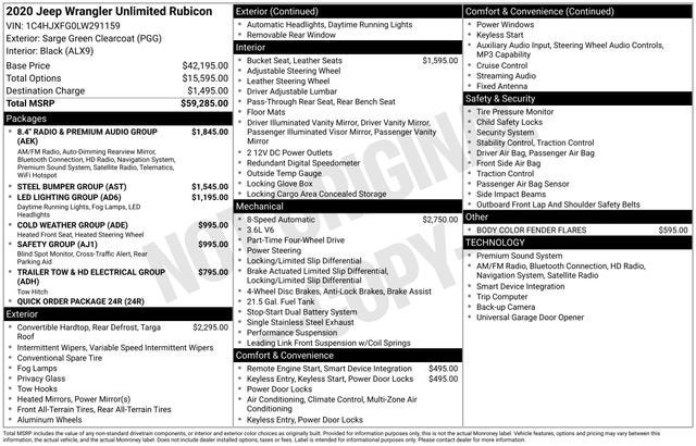 1-Year SiriusXM Guardian Trial, 240 Amp Alternator, 4-Wheel Disc Brakes, 4.10 Rear Axle Ratio, 4G LTE Wi-Fi Hot Spot, 5-Year SiriusXM Traffic Service, 5-Year SiriusXM Travel Link Service, 7 & 4 Pin Wiring Harness, 700 Amp Maintenance Free Battery, 8 Speakers, 8.4 Radio & Premium Audio Group, 8.4 Touchscreen Display, ABS brakes, Air Conditioning, Alloy wheels, Alpine Premium Audio System, AM/FM radio: SiriusXM, Apple CarPlay/Android Auto, Auto-Dimming Rear-View Mirror, Automatic temperature control, Aux Battery, Auxiliary Switches, BF Goodrich Brand Tires, Blind Spot & Cross Path Detection, Body Color 3-Piece Hard Top, Body Color Fender Flares, Brake assist, Class II Receiver Hitch, Cold Weather Group, Compass, Daytime Running Lamps LED Accents, Delay-off headlights, Driver door bin, Driver vanity mirror, Dual front impact airbags, Dual front side impact airbags, Electronic Stability Control, Emergency/Assistance Call, For Details, Visit DriveUconnect.com, Front anti-roll bar, Front Bucket Seats, Front Center Armrest w/Storage, Front dual zone A/C, Front fog lights, Front LED Fog Lamps, Front reading lights, Fully automatic headlights, Garage door transmitter, GPS Navigation, HD Radio, Heated door mirrors, Heated Front Seats, Heated Steering Wheel, Illuminated entry, Integrated roll-over protection, Leather steering wheel, LED Lighting Group, LED Reflector Headlamps, LED Taillamps, Low tire pressure warning, Non-Lock Fuel Cap w/o Discriminator, Occupant sensing airbag, Outside temperature display, Panic alarm, ParkSense Rear Park Assist System, ParkView Rear Back-Up Camera, Passenger door bin, Passenger vanity mirror, Performance Suspension, Power door mirrors, Power steering, Power windows, Premium Cloth Low-Back Bucket Seats, Quick Order Package 24R, Radio data system, Radio: Uconnect 4 w/7 Display, Radio: Uconnect 4C Nav w/8.4 Display, Rear anti-roll bar, Rear reading lights, Remote keyless entry, Remote Proximity Keyless Entry, Remote Start System, Safety Group, Security system, SiriusXM Traffic Plus, SiriusXM Travel Link, Speed control, Split folding rear seat, Steel Bumper Group, Steel Front Bumper, Steel Rear Bumper, Steering wheel mounted audio controls, Stop-Start Dual Battery System, Tachometer, Telescoping steering wheel, Tilt steering wheel, Traction control, Trailer Tow & HD Electrical Group, Trip computer, Variably intermittent wipers, Voltmeter, Wheels: 17 x 7.5 Machined w/Black Pockets.