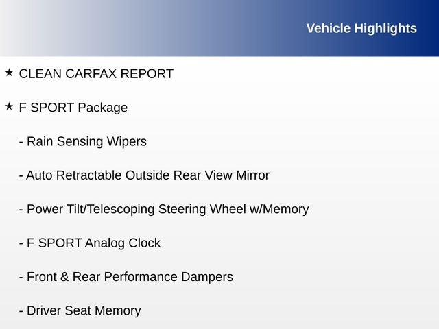 • Radio: Lexus Premium Sound System w/10 Speakers -inc: 7-inch Thin Film Transistor (TFT) LCD instrument panel display, aux and 3 USB (1 front, 2 rear) audio input plugs, Bluetooth® streaming audio, hands free phone and automatic phonebook download capabilities, CD player, HD Radio w/iTunes tagging (subscription free traffic and weather updates), integrated SiriusXM satellite radio receiver (complimentary 90-day trial subscription), remote touch interface controller w/back button, Lexus multimedia system w/8-inch color display and Scout GPS Link w/MapStream and TurnStream (complimentary for up to the first 3 years of ownership), Lexus Enform App Suite 2.0 Amazon Alexa compatible, Lexus Enform Wi-Fi (complimentary 4GB one-year trial included), Lexus Enform Remote app and Amazon Alexa compatibility (complimentary during first year of ownership), home screen divided into three customizable sections (HVAC, audio, traffic), voice command, Siri Eyes Free and Google voice control