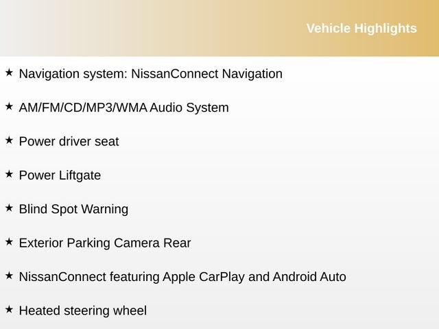 - Radio: AM/FM/CD/MP3/WMA Audio System -inc: Bose audio system w/11 speakers plus dual subwoofer, NissanConnect w/navigation featuring Apple CarPlay and Android Auto, Nissan door to door navigation w/3D building graphics and satellite imagery, connected navigation features including online POI search, door-to-door and online premium traffic information, HD Radio, SiriusXM Travel Link (weather, fuel prices, movie listings, stock info, sports and parking), SiriusXM Traffic, auxiliary audio input jack, SiriusXM satellite radio, 8" color display w/multi-touch control, 2 front illuminated USB connection ports (1 type-A, 1 type-C) for iPod interface and other compatible devices, Bluetooth® hands-free phone system, streaming audio via Bluetooth®, hands-free text-messaging assistant and 2 rear illuminated USB charge ports (1 type-A, 1 type-C)