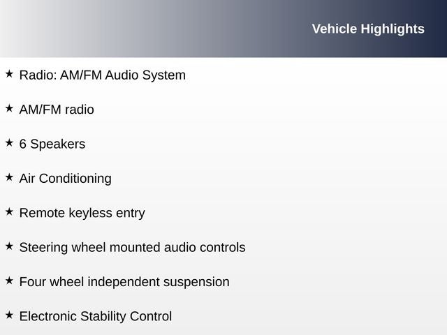 - Radio: AM/FM Audio System -inc: 8" touchscreen, 6 speakers, Apple CarPlay & Android Auto, voice recognition, USB/aux input ports, steering wheel controls and Bluetooth® w/audio streaming