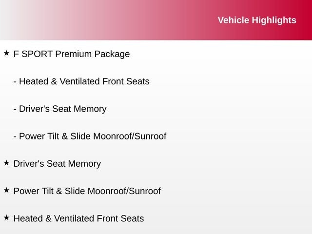 Driver's Seat Memory, F SPORT Premium Package, Heated & Ventilated Front Seats, Power Tilt & Slide Moonroof/Sunroof, 4-Wheel Disc Brakes, 8 Speakers, ABS brakes, Active Sound Control, Air Conditioning, Alloy wheels, Aluminum Pedals & Foot Rest, AM/FM radio: SiriusXM, Apple CarPlay/Android Auto, Auto High-beam Headlights, Auto-dimming door mirrors, Automatic temperature control, Axle Ratio: 4.117, Black Headliner, Brake assist, Bumpers: body-color, CD player, Deeply Bolstered Sport Front Bucket Seats, Delay-off headlights, Driver door bin, Driver vanity mirror, Dual front impact airbags, Dual front side impact airbags, Electronic Stability Control, Emergency communication system: Enform Safety Connect (complimentary 3-year subscription), Enhanced LED Daytime Running Lights, Exterior Parking Camera Rear, F SPORT Door Scuff Plates, F SPORT NuLuxe Seat Trim, F SPORT Side & Rear Badging, Four wheel independent suspension, Front & Rear Performance Rods, Front anti-roll bar, Front Bucket Seats, Front Center Armrest, Front dual zone A/C, Front Fog & Driving Lamp, Front fog lights, Front reading lights, Fully automatic headlights, Heated door mirrors, High Clearance Lamp, Illuminated entry, Knee airbag, Leather Shift Knob, Lexus Enform Remote, Lexus Enform Wi-Fi, Low tire pressure warning, Metallic Sport Trim, Occupant sensing airbag, Outside temperature display, Overhead airbag, Panic alarm, Passenger door bin, Passenger vanity mirror, Power door mirrors, Power driver seat, Power passenger seat, Power steering, Power windows, Radio data system, Radio: 8-Speaker Premium Sound System, Rear anti-roll bar, Rear seat center armrest, Rear window defroster, Rear window wiper, Remote keyless entry, Roof rack: rails only, Security system, Speed control, Speed-sensing steering, Split folding rear seat, Spoiler, Sport Tuned Suspension, Steering wheel mounted audio controls, Tachometer, Telescoping steering wheel, Tilt steering wheel, Traction control, Trip computer, Turbo Boost Gauge and G-Meter, Turn signal indicator mirrors, Unique Front Bumper w/Mesh Grille Insert, Unique Gear Shift, Variably intermittent wipers, Wheels: 18 x 7.5 F SPORT Split-5-Spoke Alloy, Driver's Seat Memory, F SPORT Premium Package, Heated & Ventilated Front Seats, Power Tilt & Slide Moonroof/Sunroof.