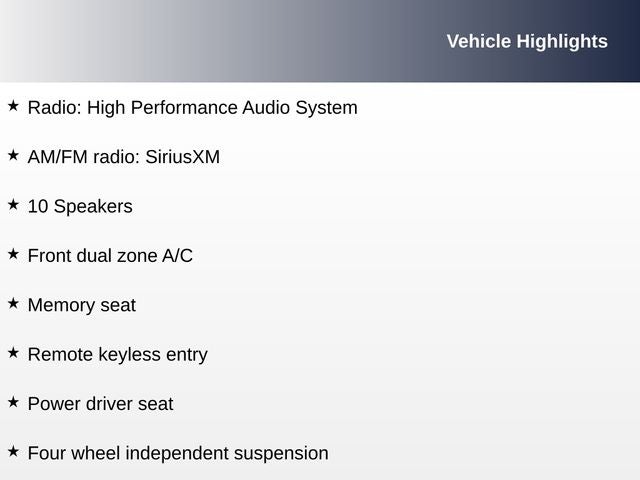 - Radio: High Performance Audio System -inc: 220-watt audio w/10 speakers, 9" integrated Sensus connect touchscreen, Bluetooth® connectivity w/audio streaming, SiriusXM satellite radio w/complimentary audio trial subscription, smartphone integration (Apple CarPlay/Android Auto), 2 front USB-A Ports, 2 rear USB-C and voice control