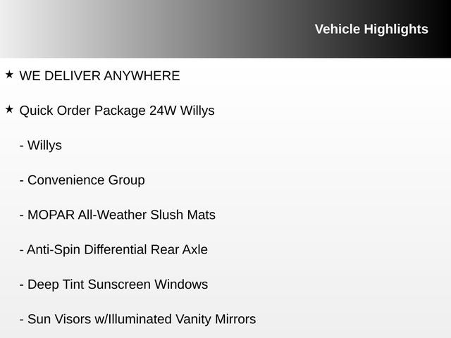 Firecracker Red Clearcoat 2022 Jeep Gladiator Willys 4WD 8-Speed Automatic 3.6L V6 24V VVT WE DELIVER ANYWHERE, 8.4 Radio & Premium Audio Group, Convenience Group, Quick Order Package 24W Willys, Technology Group, Trailer Tow Package, 110 MPH Vehicle Max Speed Calibration, 115V Auxiliary Power Outlet, 2-Door Passive Entry, Front Door Locks, 3.73 Rear Axle Ratio, 4-Wheel Disc Brakes, 8 Speakers, ABS brakes, Air Conditioning, Air Conditioning w/Auto Temperature Control, Alpine Premium Audio System, AM/FM radio, Apple CarPlay, Apple CarPlay/Android Auto, Black 3-Piece Hard Top, Black Grille, Brake assist, Class IV Receiver Hitch, Cloth Low-Back Bucket Seats, Cluster 7.0 TFT Color Display, Compass, Delay-off headlights, Driver door bin, Driver vanity mirror, Dual front impact airbags, Dual front side impact airbags, Electronic Stability Control, Emergency communication system: SiriusXM Guardian, Front anti-roll bar, Front Bucket Seats, Front Center Armrest w/Storage, Front fog lights, Front reading lights, Google Android Auto, GPS Antenna Input, Integrated Center Stack Radio, Integrated roll-over protection, Integrated Voice Command w/Bluetooth®, Low tire pressure warning, MOPAR Spray In Bedliner, Normal Duty Suspension, Occupant sensing airbag, Outside temperature display, ParkView Rear Back-Up Camera, Passenger door bin, Passenger vanity mirror, Power steering, Radio data system, Radio: Uconnect 4 w/7 Display, Radio: Uconnect 4C Nav w/8.4 Display, Rear anti-roll bar, Rear reading lights, Rear Sliding Window, SiriusXM Satellite Radio, Speed control, Split folding rear seat, Steering wheel mounted audio controls, Tachometer, Telescoping steering wheel, Tilt steering wheel, Traction control, Trip computer, USB Host Flip, Variably intermittent wipers, Wheels: 17 x 7.5 Black Steel Styled, 8.4 Radio & Premium Audio Group, Convenience Group, Quick Order Package 24W Willys, Technology Group, Trailer Tow Package.