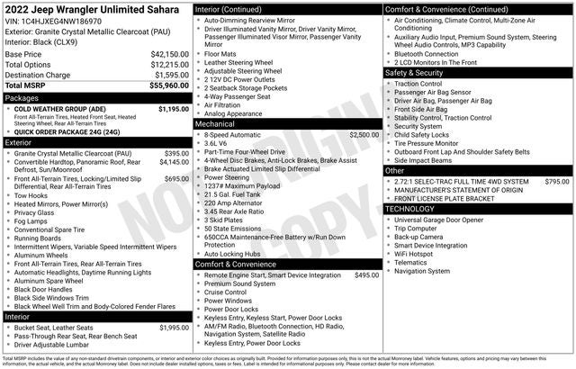 This 2022 Jeep Wrangler Unlimited Sahara has been meticulously inspected and certified to ensure it meets the highest standards of quality and reliability. You can drive with confidence, knowing that this Jeep has been thoroughly checked and is ready to provide you with years of dependable service.