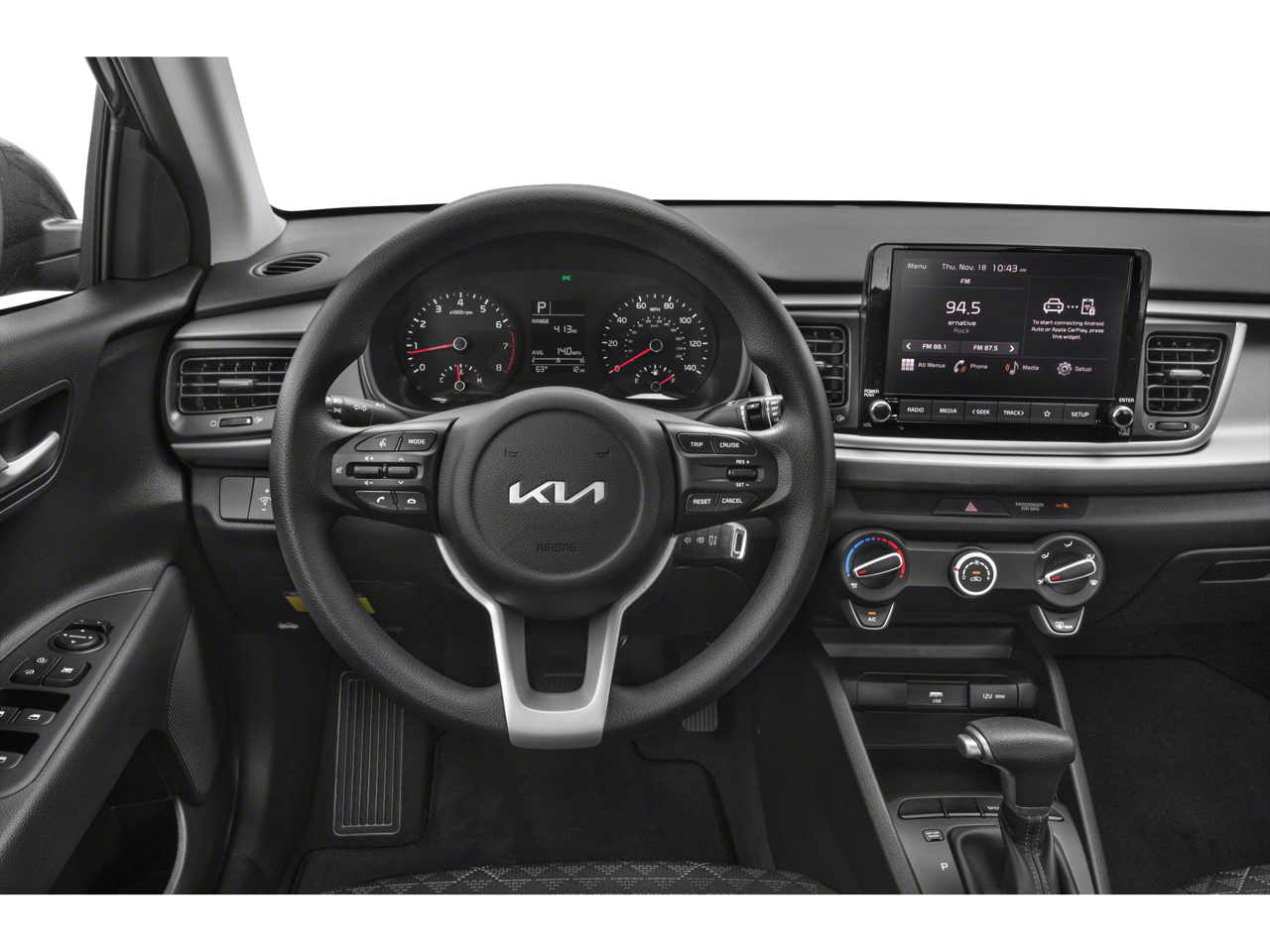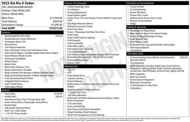 CARFAX One-Owner. Clear White 2022 Kia Rio S FWD CVT 1.6L 4-Cylinder 6 Speakers, ABS brakes, Air Conditioning, AM/FM radio, Brake assist, Bumpers: body-color, Cargo Net, Carpet Floor Mat, Driver door bin, Driver vanity mirror, Dual front impact airbags, Dual front side impact airbags, EC Mirror w/HomeLink, Electronic Stability Control, Front anti-roll bar, Front Bucket Seats, Front Center Armrest, Front reading lights, Front wheel independent suspension, Fully automatic headlights, Heated door mirrors, Illuminated entry, Low tire pressure warning, Occupant sensing airbag, Outside temperature display, Overhead airbag, Overhead console, Panic alarm, Passenger door bin, Passenger vanity mirror, Power door mirrors, Power steering, Power windows, Radio: AM/FM/MP3 Audio System, Rear Bumper Applique, Rear window defroster, Remote keyless entry, Speed control, Speed-sensing steering, Split folding rear seat, Steering wheel mounted audio controls, Tachometer, Tilt steering wheel, Traction control, Trip computer, Variably intermittent wipers, Wheels: 15 x 5.5J Steel w/Full Covers, Woven Cloth Seat Trim.