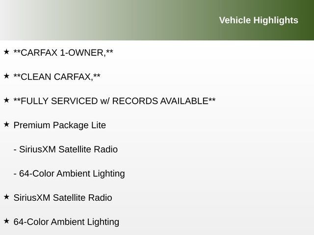 **CARFAX 1-OWNER,**, **CLEAN CARFAX,**, **FULLY SERVICED w/ RECORDS AVAILABLE**, 64-Color Ambient Lighting, Premium Package Lite, SiriusXM Satellite Radio.
