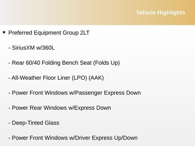 - Convenience Package includes (CJ2) dual-zone automatic climate control, (A2X) 10-way power driver seat including power lumbar, (KA1) heated driver and passenger seats, (N57) wrapped steering wheel, (KI3) heated steering wheel, (KI4) 120-volt power outlet, (KC9) 120-volt bed-mounted power outlet, (UBI) 2 charge-only USB ports for second row, (C49) rear-window defogger, (AVJ) Keyless Open and Start, (BTV) Remote Start and (UTJ) content theft alarm. (Upgradeable to (A50) bucket seats and includes (D07) center console.)