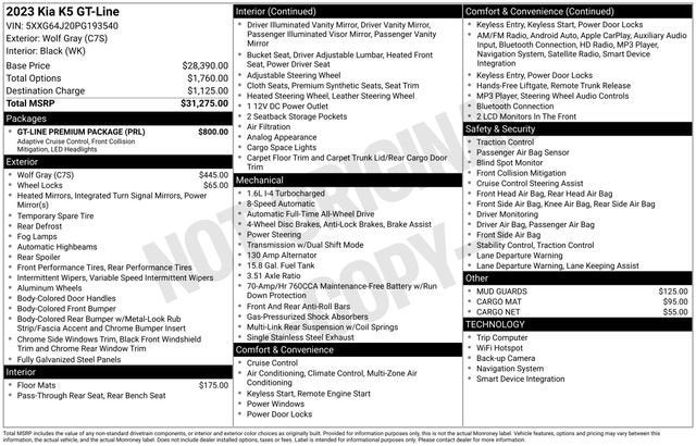 Beneath the sleek exterior lies a 1.6L I4 DGI Turbocharged engine that delivers an impressive 180 horsepower, paired with an 8-speed automatic transmission and all-wheel drive for exceptional performance and control. With an EPA-estimated 25 city/33 highway mpg, the K5 GT-Line offers the perfect balance of power and efficiency.