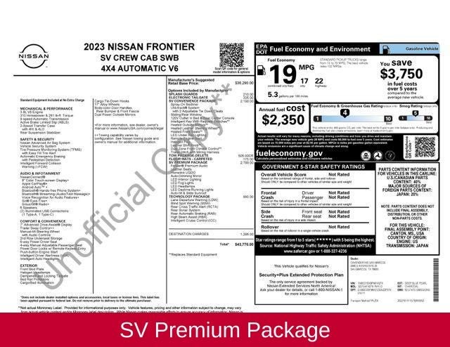 The SV Convenience Package and SV Premium Package elevate this Frontier with a wealth of premium amenities, including heated front seats, a heated leather-wrapped steering wheel, a sliding rear window, and a spray-in bedliner. The available Technology Package further enhances safety and convenience with features like rear automatic braking, intelligent cruise control, and high beam assist.