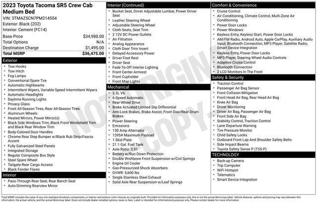 Step inside the Tacoma V6, and you'll be greeted by a spacious and well-appointed interior, featuring a range of premium amenities that elevate your driving experience. The truck's Fabric Seat Trim and Leather Seat Trim offer exceptional comfort, while the Split folding rear seat provides versatile cargo-carrying capabilities. Stay connected with the advanced infotainment system, which includes SiriusXM radio, Apple CarPlay, and Android Auto integration.