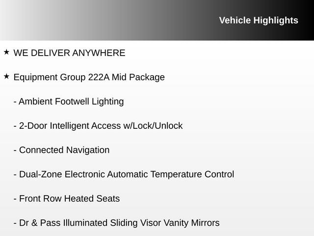 • SYNC 4 -inc: 12" LCD capacitive touchscreen w/swipe capability, wireless phone connection, cloud connected, AppLink w/app catalog, 911 Assist, wireless Apple CarPlay and Android Auto compatibility, digital owner's manual and conversational voice command recognition