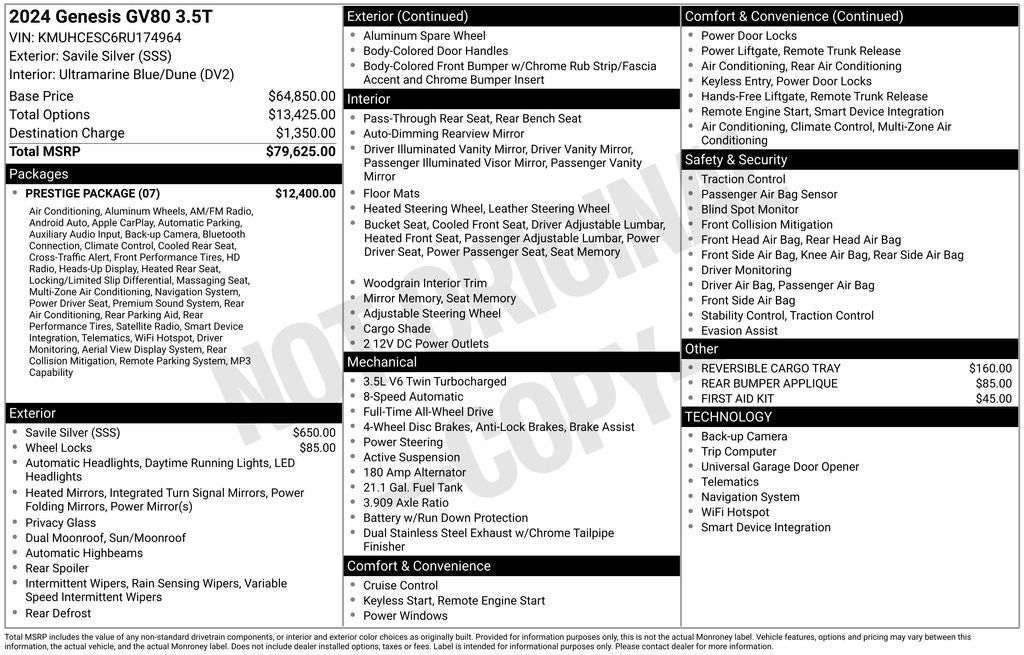 Step inside the GV80 and be enveloped in a world of luxury. The Prestige Package adorns the cabin with genuine wood accents, a premium Lexicon audio system, and a host of advanced features that elevate every journey. Enjoy the comfort of heated and ventilated front seats, a power moonroof, and the convenience of a power liftgate.