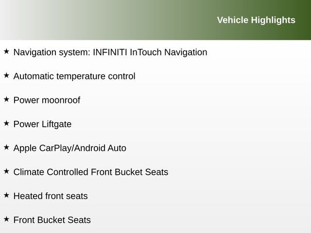 Apple CarPlay/Android Auto, Automatic temperature control, Climate Controlled Front Bucket Seats, Front Bucket Seats, Heated front seats, Navigation system: INFINITI InTouch Navigation, Power Liftgate, Power moonroof.