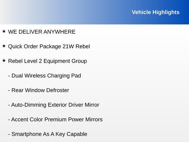 Billet Silver Metallic Clearcoat 2025 Ram 1500 Rebel 4WD 8-Speed Automatic 3.0L I6 WE DELIVER ANYWHERE, 115V Auxiliary Rear Power Outlet, 2-Door Passive Entry, Front Door Locks, 4G LTE Wi-Fi Hot Spot, Accent Color Door Handles, Accent Color Premium Power Mirrors, Accent Color Tailgate Handle, Apple CarPlay, Auto Power-Folding Mirrors, Auto-Dimming Exterior Driver Mirror, Black Painted Exterior Mirrors Caps, Connected Travel & Traffic Services, Connectivity - US/Canada, Convex Wide-Angle Exterior Mirror Insert, Driver Seat Memory, Dual Wireless Charging Pad, Exterior Mirrors Approach Lamps, Exterior Mirrors Courtesy Lamps, Exterior Mirrors w/Heating Element, Exterior Mirrors w/Memory, Exterior Mirrors w/Supplemental Signals, Front Passenger Interactive Display, Google Android Auto, GPS Antenna Input, GPS Navigation, harman/kardon 19 Speaker Premium Sound, HD Radio, Heated Second Row Seats, Integrated Voice Command w/Bluetooth®, Media Hub w/2 Charge Only USBs, Off-Road Information Pages, Power Adjust 8-Way Front Passenger Seat, Power Adjustable Pedals w/Memory, Power Tailgate, Proximity Approach/Departure Lamps, Quick Order Package 21W Rebel, Radio: Uconnect 5 Nav w/14.4 Display, Radio/Driver Seat/Mirrors/Pedals Memory, Rain Sensitive Windshield Wipers, Rear Window Defroster, Rebel Level 2 Equipment Group, Security Alarm, SiriusXM w/360L, Smartphone As A Key Capable, USB Host Flip, 10 Speakers, 3.92 Rear Axle Ratio, 33 Gallon Fuel Tank, 4 Way Front Headrests, 4-Wheel Disc Brakes, ABS brakes, Air Conditioning, Alloy wheels, AM/FM radio: SiriusXM with 360L, Apple CarPlay/Android Auto, Auto High-beam Headlights, Auto-dimming Rear-View mirror, Automatic temperature control, Brake assist, Bucket Seats, Cloth/Vinyl Bucket Seats, Compass, Delay-off headlights, Driver door bin, Driver vanity mirror, Dual front impact airbags, Dual front side impact airbags, Electronic Stability Control, Front anti-roll bar, Front Bucket Seats, Front Center Armrest w/Storage, Front dual zone A/C, Front fog lights, Front reading lights, Front Seat Back Map Pockets, Front wheel independent suspension, Full Length Upgraded Floor Console, Fully automatic headlights, Garage door transmitter, Heated door mirrors, Heated front seats, Heated steering wheel, Illuminated entry, Leather steering wheel, Low tire pressure warning, Manual Folding Exterior Mirrors, Mopar Black Tubular Side Steps, Navigation System, Occupant sensing airbag, Outside temperature display, Overhead airbag, Overhead console, Panic alarm, ParkView Rear Back-Up Camera, Passenger door bin, Passenger vanity mirror, Power Adjust 8-Way Driver Seat, Power door mirrors, Power driver seat, Power steering, Power windows, Radio data system, Radio: Uconnect 5 Nav w/12.0 Display, Rear 60/40 Folding Seat, Rear anti-roll bar, Rear seat center armrest, Rear step bumper, Remote keyless entry, Speed control, Split folding rear seat, Steering wheel mounted audio controls, Tachometer, Telescoping steering wheel, Tilt steering wheel, Traction control, Trip computer, Variably intermittent wipers, Voltmeter, Wheels: 18 x 8.0 Painted Mid-Gloss Black, 115V Auxiliary Rear Power Outlet, 2-Door Passive Entry, Front Door Locks, 4G LTE Wi-Fi Hot Spot, Accent Color Door Handles, Accent Color Premium Power Mirrors, Accent Color Tailgate Handle, Apple CarPlay, Auto Power-Folding Mirrors, Auto-Dimming Exterior Driver Mirror, Black Painted Exterior Mirrors Caps, Connected Travel & Traffic Services, Connectivity - US/Canada, Convex Wide-Angle Exterior Mirror Insert, Driver Seat Memory, Dual Wireless Charging Pad, Exterior Mirrors Approach Lamps, Exterior Mirrors Courtesy Lamps, Exterior Mirrors w/Heating Element, Exterior Mirrors w/Memory, Exterior Mirrors w/Supplemental Signals, Front Passenger Interactive Display, Google Android Auto, GPS Antenna Input, GPS Navigation, harman/kardon 19 Speaker Premium Sound, HD Radio, Heated Second Row S