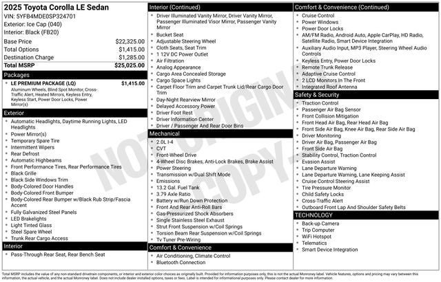 Discover the true value of this 2025 Toyota Corolla LE. With its sleek styling, advanced features, and exceptional efficiency, this sedan is the perfect choice for the discerning driver. Experience the difference for yourself by scheduling a test drive today.
