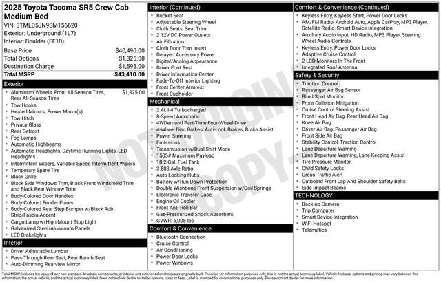 Clean CARFAX. Underground 2025 Toyota Tacoma SR5 2.4L 4-Cylinder 8-Speed Automatic 4WD
