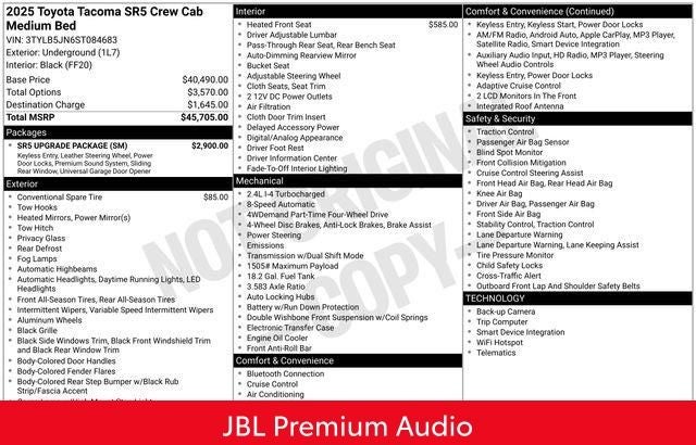Beyond its impressive capabilities, this Tacoma SR5 is packed with premium features that elevate your driving experience. Enjoy the convenience of keyless entry and start, the clarity of JBL premium audio, and the connectivity of integrated trailer brake controls. The SR5 Upgrade Package also includes a power rear window, a leather-wrapped steering wheel, and a handy under-seat storage compartment.
