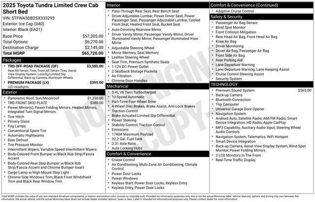 Designed to tackle any terrain, the Tundra Limited is equipped with the TRD Off-Road Package, featuring skid plates, mud guards, a TRD leather shift knob, and the innovative Multi-Terrain Select system. Whether you're navigating the urban jungle or exploring the great outdoors, this truck is ready to take you there in style and comfort.