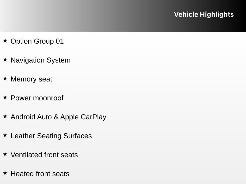 Android Auto & Apple CarPlay, Heated front seats, Leather Seating Surfaces, Memory seat, Navigation System, Option Group 01, Power moonroof, Rain sensing wipers, Ventilated front seats.