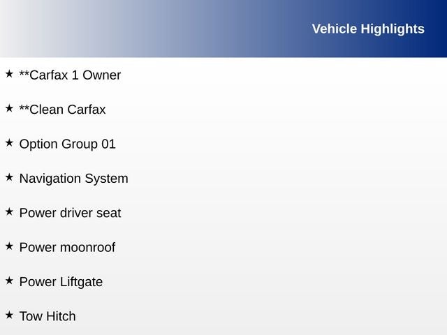 **Carfax 1 Owner, **Clean Carfax, AWD, Black Premium Synthetic, Navigation System, Option Group 01, Power driver seat, Power Liftgate, Power moonroof, Tow Hitch.