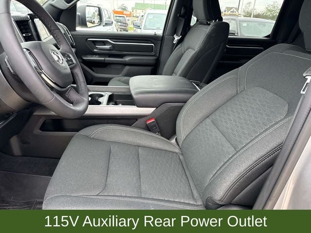 115V Auxiliary Power Outlet, 115V Auxiliary Rear Power Outlet, 12 Touchscreen Display, 3 Rear Seat Head Restraints, 4 Way Front Headrests, 400W Inverter, 4G LTE Wi-Fi Hot Spot, 6 Speakers, Accent Color Door Handles, Accent Color Premium Power Mirrors, Accent Color Tailgate Handle, AM/FM radio, Anti-Spin Differential Rear Axle, Apple CarPlay, Auto Power-Folding Mirrors, Auto-Dimming Exterior Driver Mirror, Auto-Dimming Rear-View Mirror, Bed Utility Group, Big Horn Level 2 Equipment Group, Black Exterior Mirrors, Black Exterior Truck Badging, Black Headlamp Bezels, Black Interior Accents, Black Painted Exterior Mirrors Caps, Black Premium Power Mirrors, Black Tail Lamp Bezels, Body Color Fender Flares, Body Color Front Bumper, Bucket Seats, Center Console Parts Module, Cluster 7.0 TFT Color Display, Configurable Drive Mode, Connectivity - US/Canada, Convex Wide-Angle Exterior Mirror Insert, Deluxe Cloth Bucket Seats, Disassociated Touchscreen Display, Exterior 115V AC Outlet, Exterior Mirrors Courtesy Lamps, Front Seat Back Map Pockets, Full Length Floor Console, Glove Box Lamp, Google Android Auto, GPS Antenna Input, GPS Navigation, Grille Black Surround Black Mesh, HD Radio, Heated Front Seats, Heated Steering Wheel, Integrated Center Stack Radio, Leather Wrapped Steering Wheel, LED Footwell Lighting, Manual Adjust 4-Way Front Passenger Seat, MOPAR 4 Adjustable Cargo Tie-Down Hooks, Night Edition, Overhead LED Lamps, Pick-Up Box Lighting, Power 2-Way Driver Lumbar Adjust, Power Adjust 8-Way Driver Seat, Power Adjustable Pedals, Premium Overhead Console, Quick Order Package 21Z Big Horn, Radio data system, RAM Grille Badge - Black, Rear 60/40 Folding Seat, Rear Center Armrest, Rear Power Sliding Window, Rear Window Defroster, Remote Tailgate Release, Security Alarm, SiriusXM Radio Service, Steering Wheel Mounted Audio Controls, Universal Garage Door Opener, USB Host Flip, Wheels: 20 x 9.0 Aluminum Painted Clad.